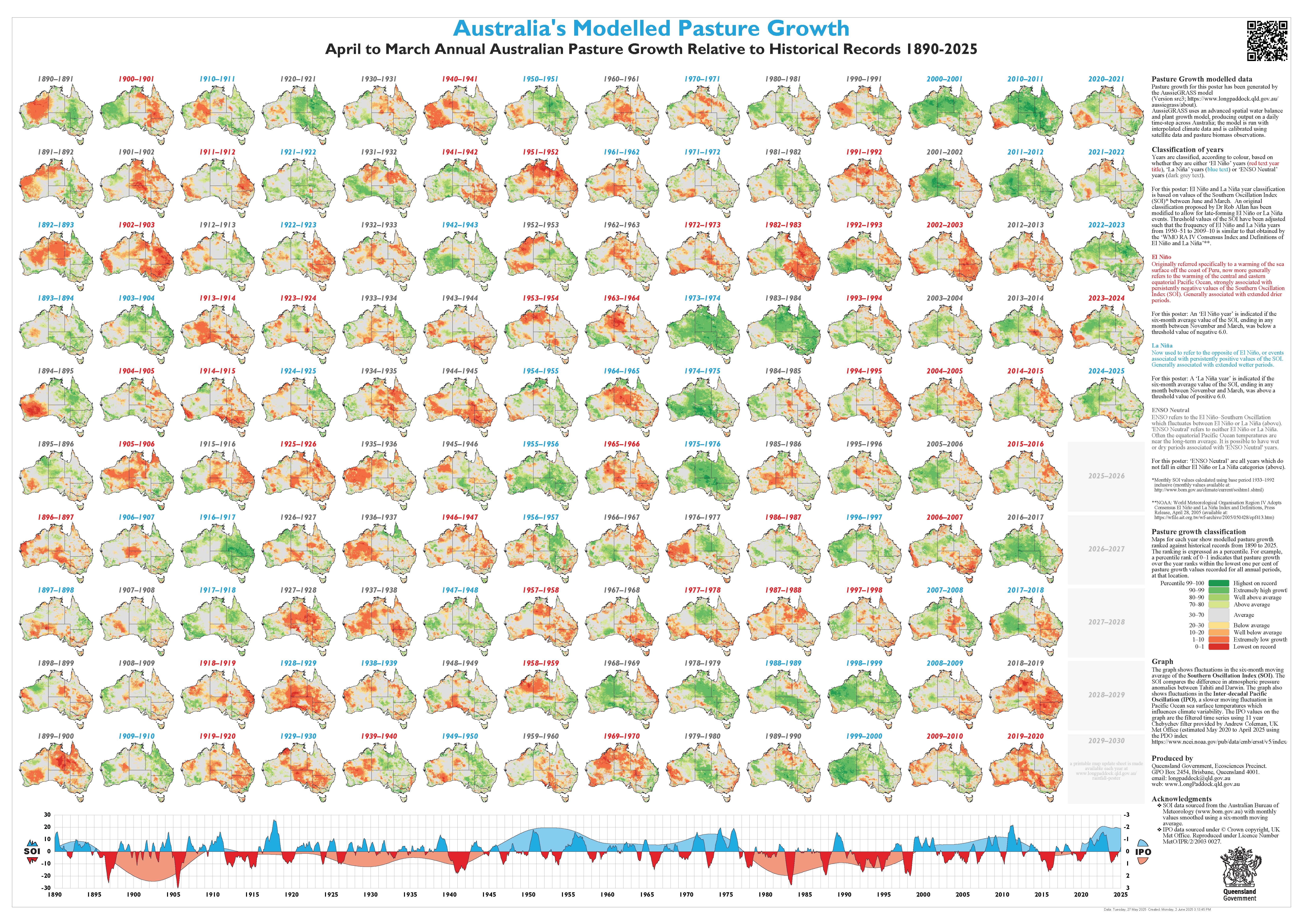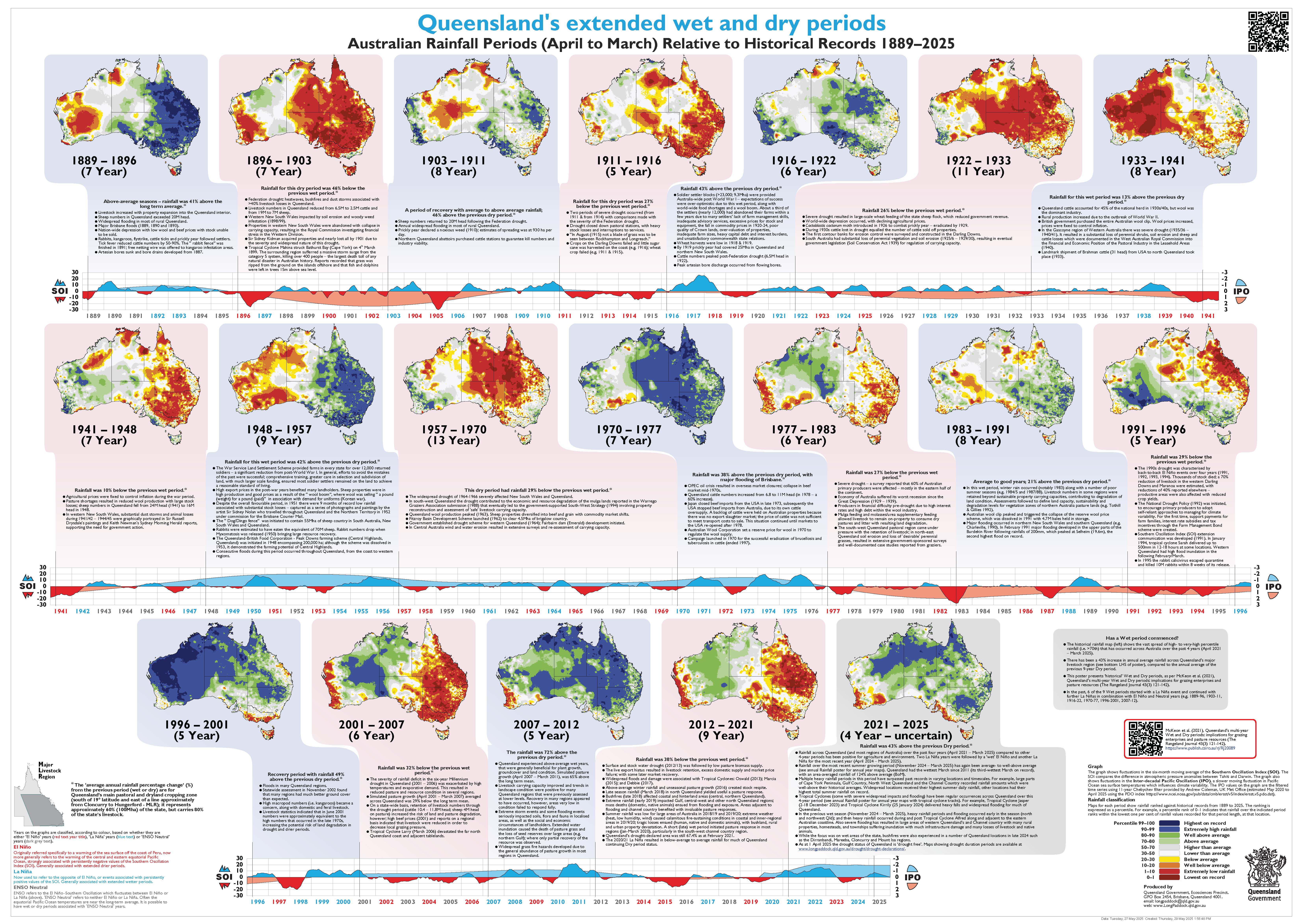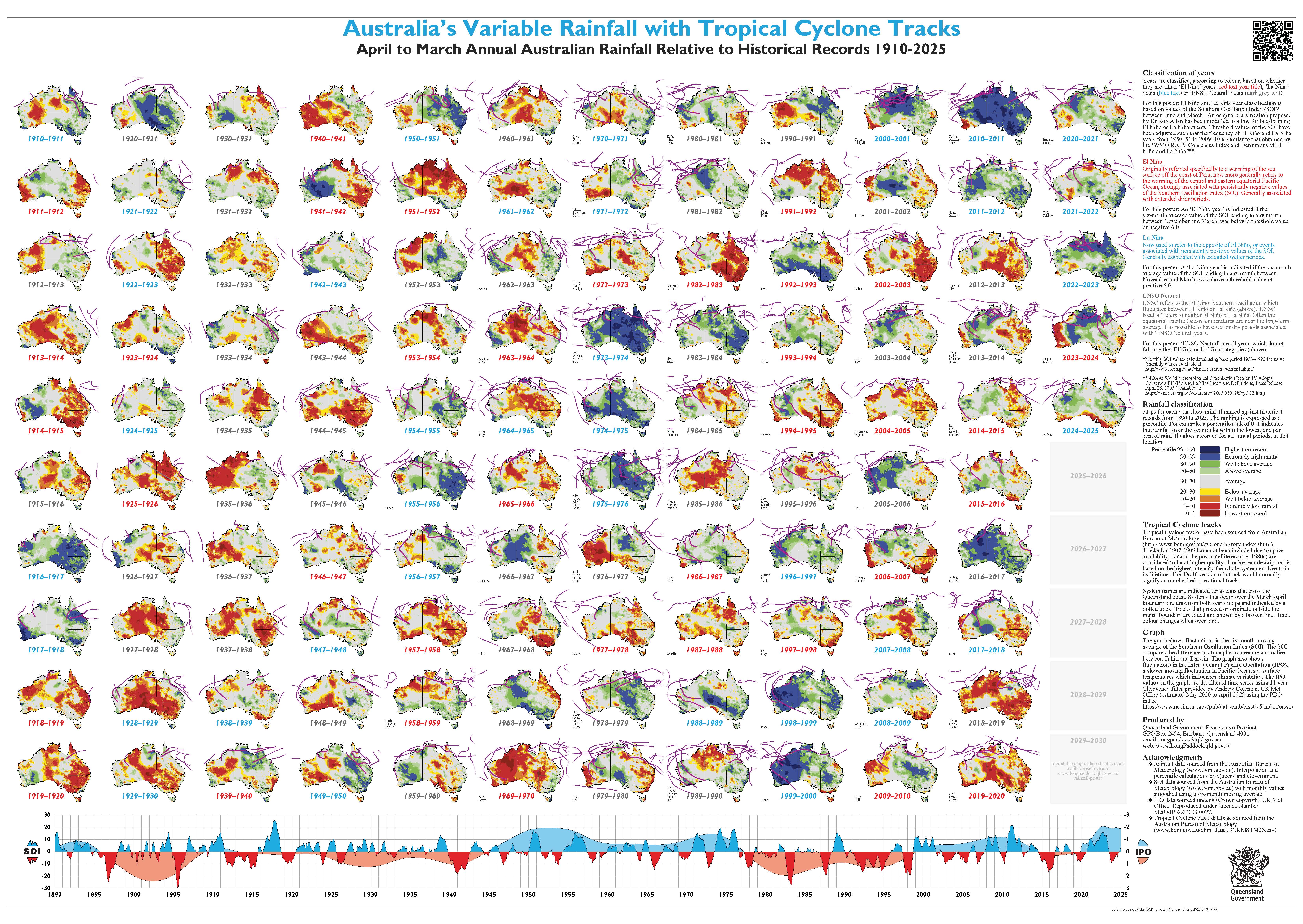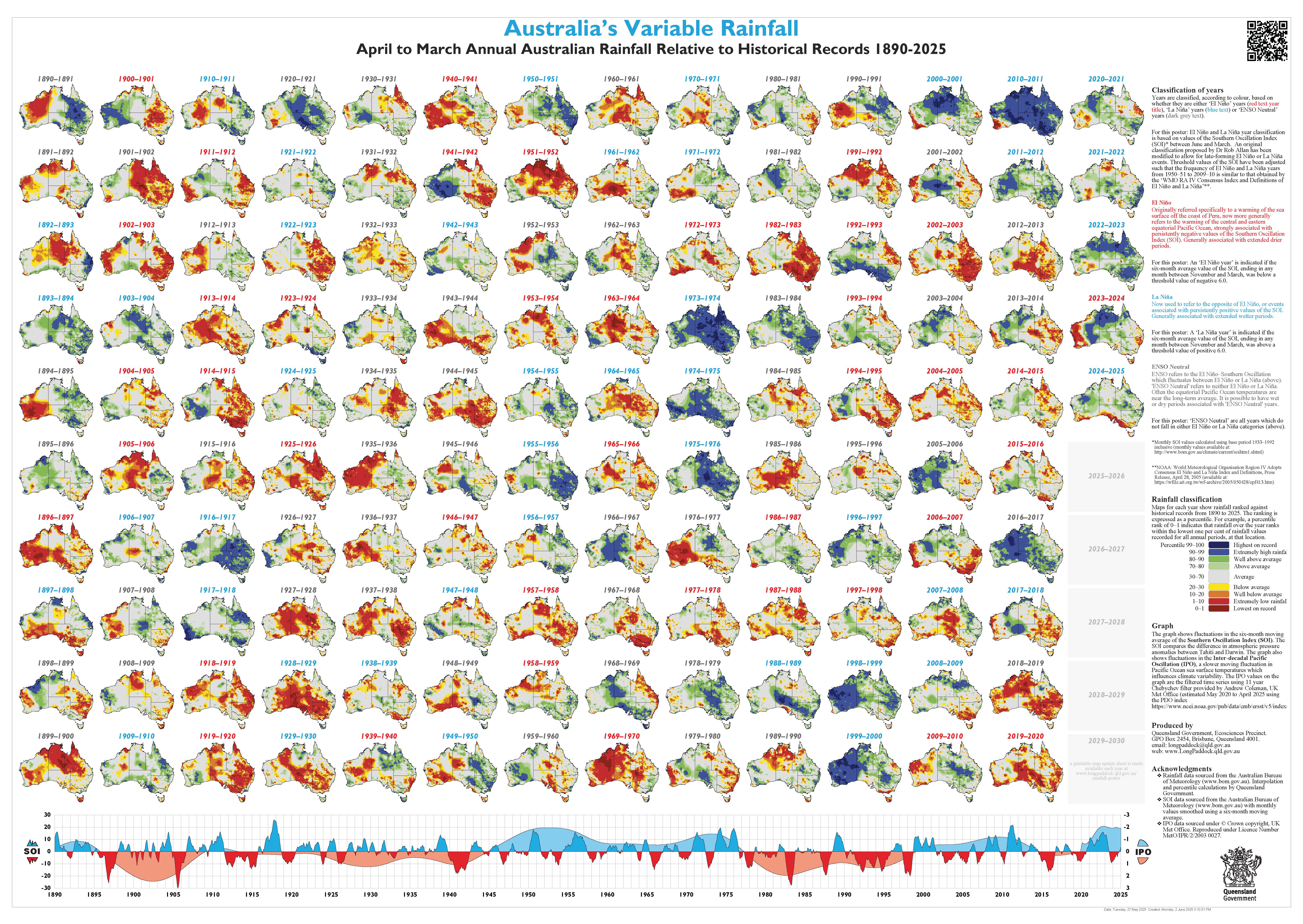This version of Australia's Variable Rainfall Poster depicts twelve monthly rainfall (April-March) in maps for the years 1890 through to 2025 alongside a graph of Southern Oscillation Index and Interdecadal Pacific Oscillation values.